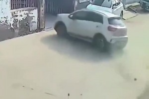 丝滑!两车在十字路口相撞!白车竟然直接漂移进人家院子里